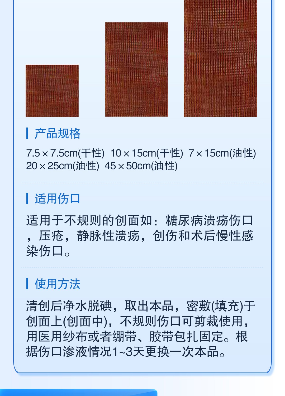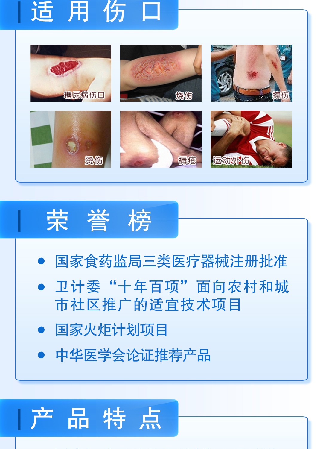 适用范围: 烧烫伤创面、供皮区创面;慢性感染性伤口,如糖尿病溃疡伤口、压疮、静脉性溃疡、创伤和术后慢性感染伤口等。